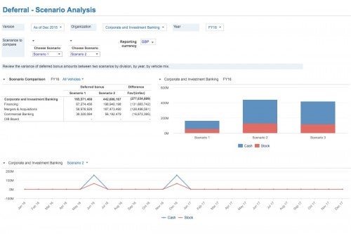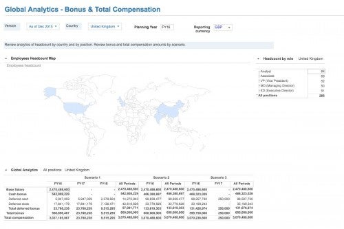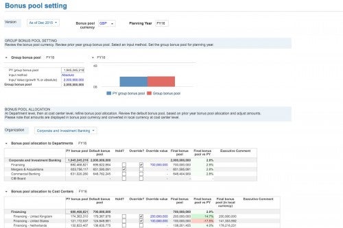 The Anaplan Global Compensation for Banking model example provides large banks with a scalable and agile planning and modeling platform, allowing reward teams to model out and optimize bonus pools and deferral calculations across the entire organization, and also benchmark employees’ performance.
