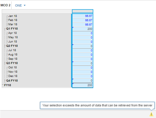 On a module grid, selecting a row or column that does not have a dimension will result in the Quick Sum bar warning you that: "Your selection exceeds the amount of data that can be retrieved from the server".