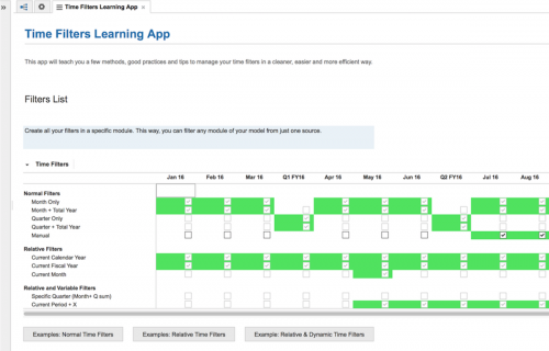 This Learning model example teaches model builders the best way to easily apply time filters to modules in order to increase usage and performance of their models.